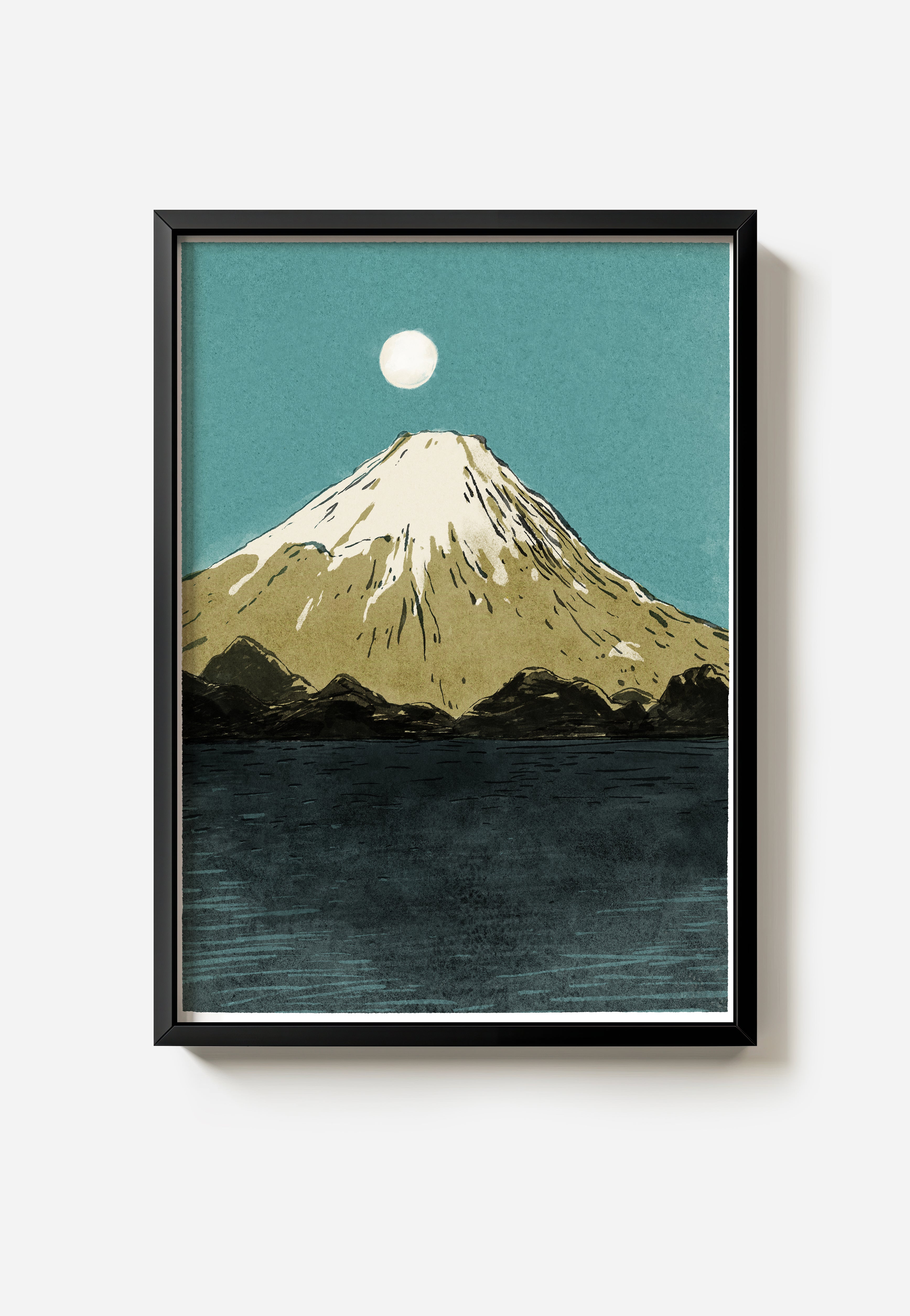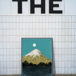 Scenic view of a full moon rising over Pearl Fuji reflected in calm waters, illustrated by Luis Mendo.